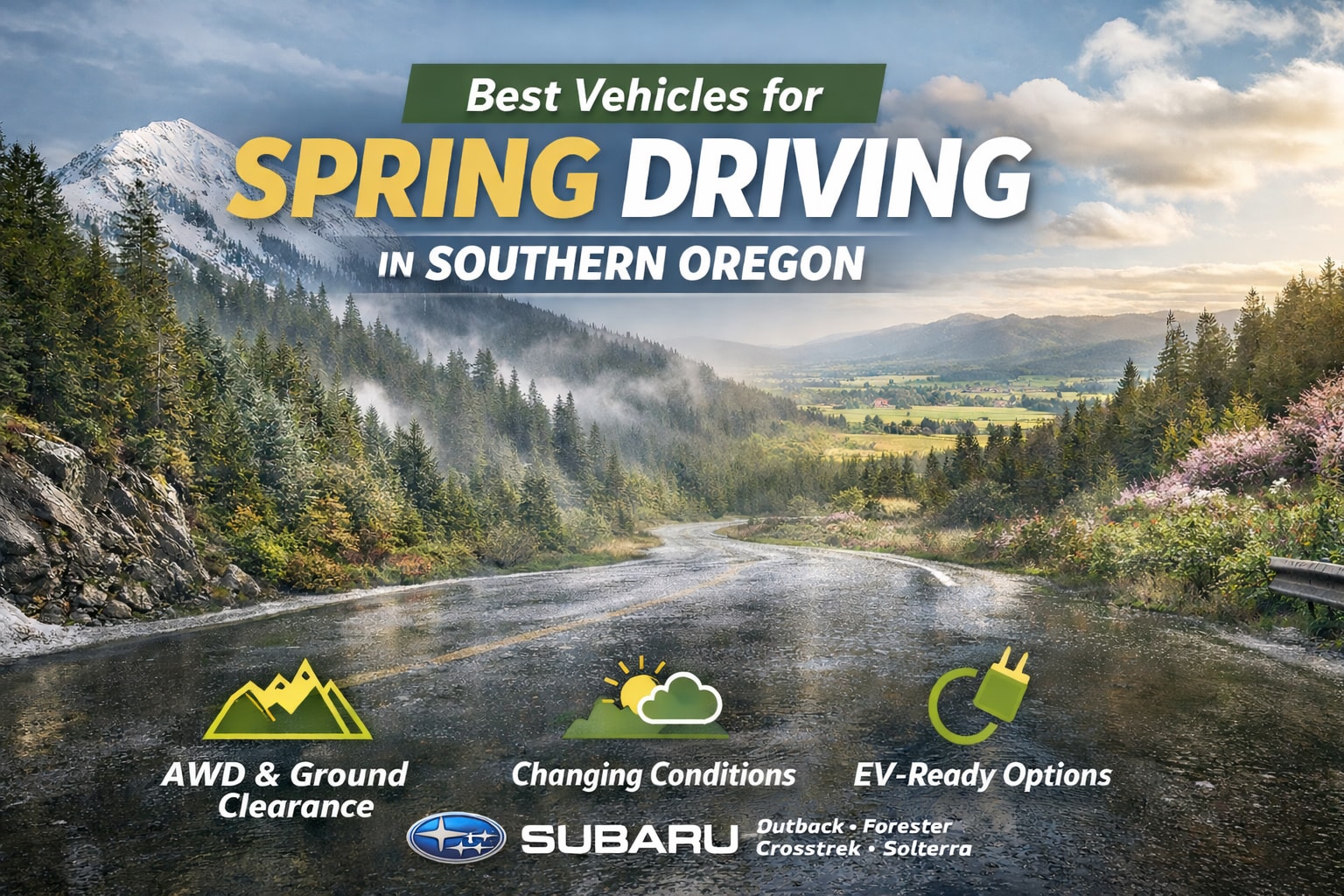 The best vehicles for spring driving in Southern Oregon are those that handle wet roads, changing temperatures, elevation shifts, and unpredictable conditions. Subaru models like the Forester, Outback, Crosstrek, and all-electric Solterra stand out thanks to Symmetrical All-Wheel Drive, strong ground clearance, and advanced safety features.