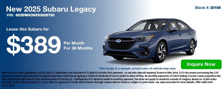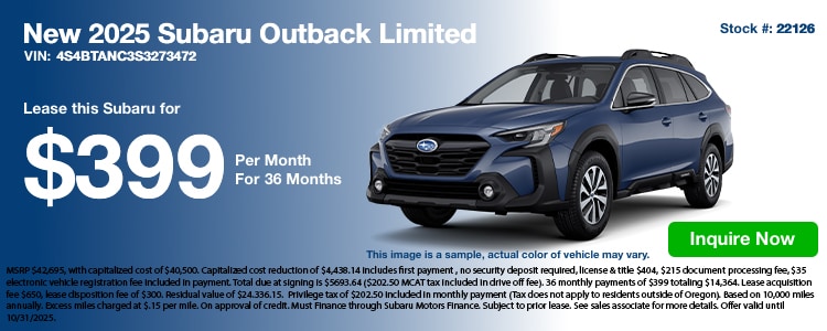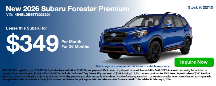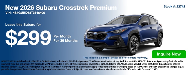 Check out our lease specials. If you have questions, feel free to contact us about our new Subaru lease specials or even to schedule a test drive online! We hope to see you soon at our Southern Oregon Subaru Medford, OR dealership!